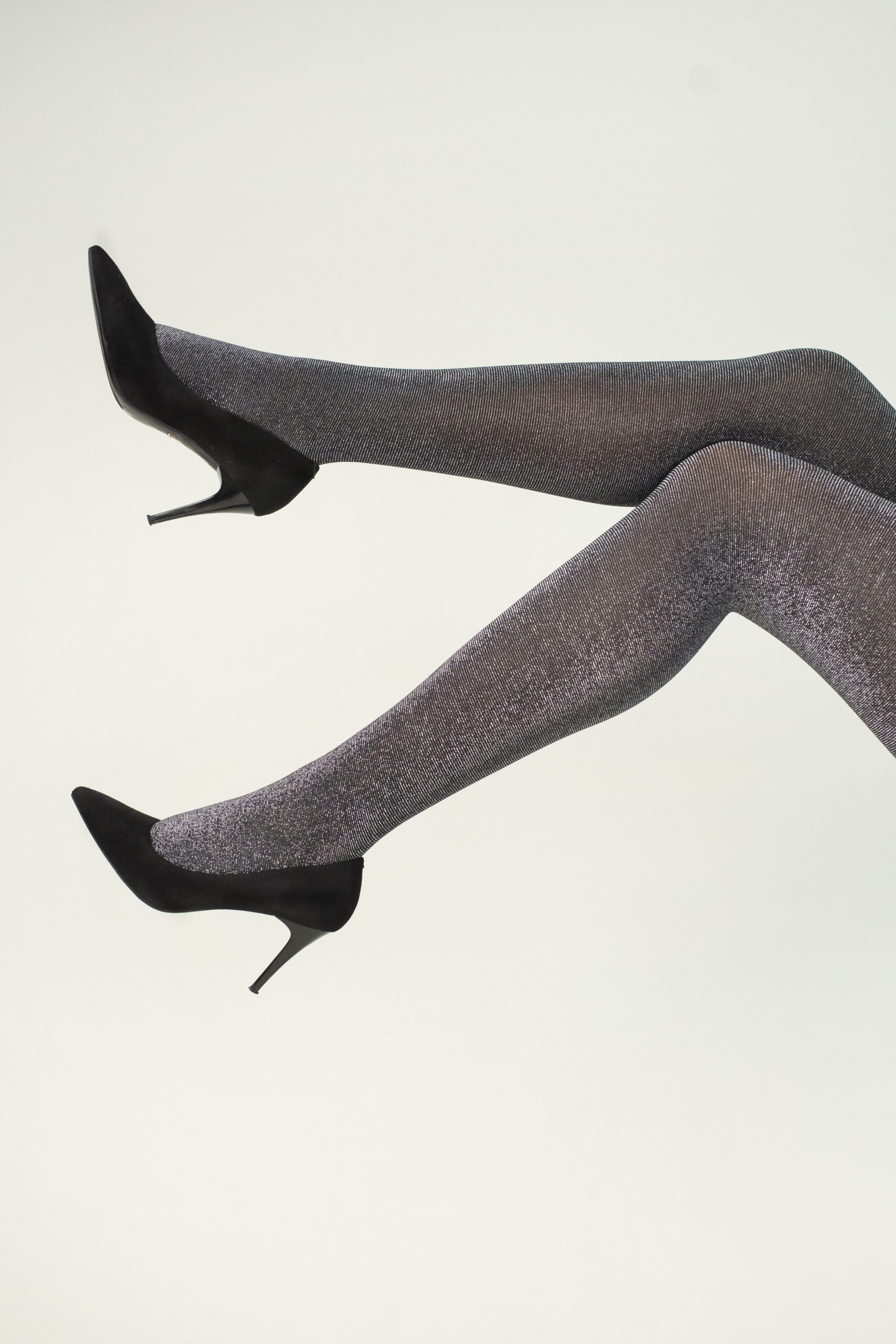 Stylowe rajstopy z mikrofibry 30 DEN ozdobione delikatną, srebrną lub złotą nitką pięknie mienią się w świetle, dodając nogom eleganckiego blasku.